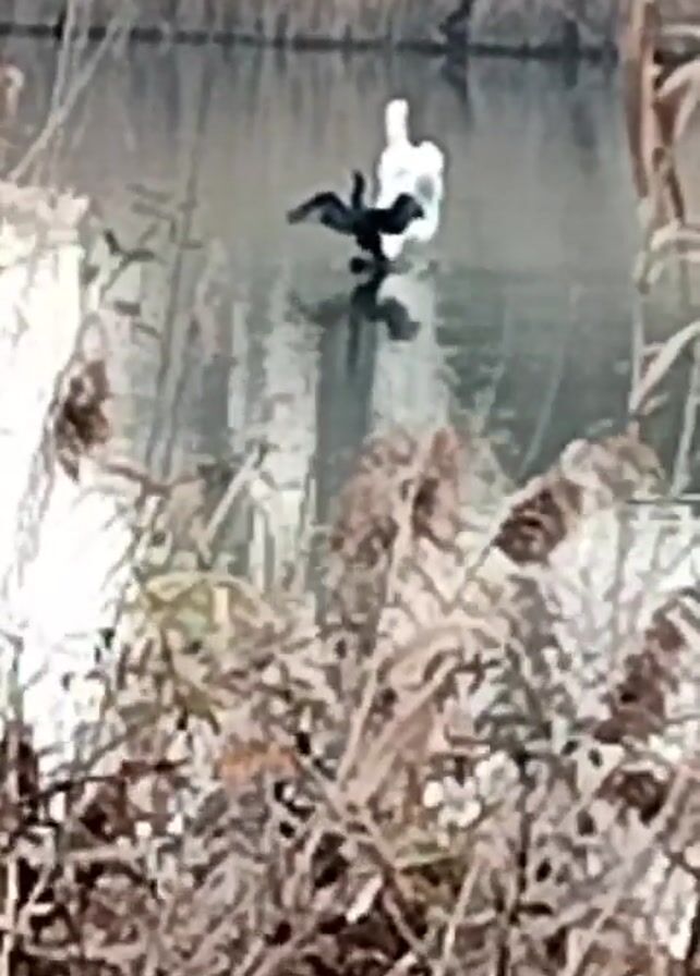 still shot of a body of water with a white swan and a black bird in it. The black bird is standing on a rock or small island in the water, with its wings spread out. There is tall grass and reeds in the foreground, and some trees and bushes in the background. The overall tone of the video is calm and peaceful. The water is relatively still, and the birds appear to be undisturbed.
