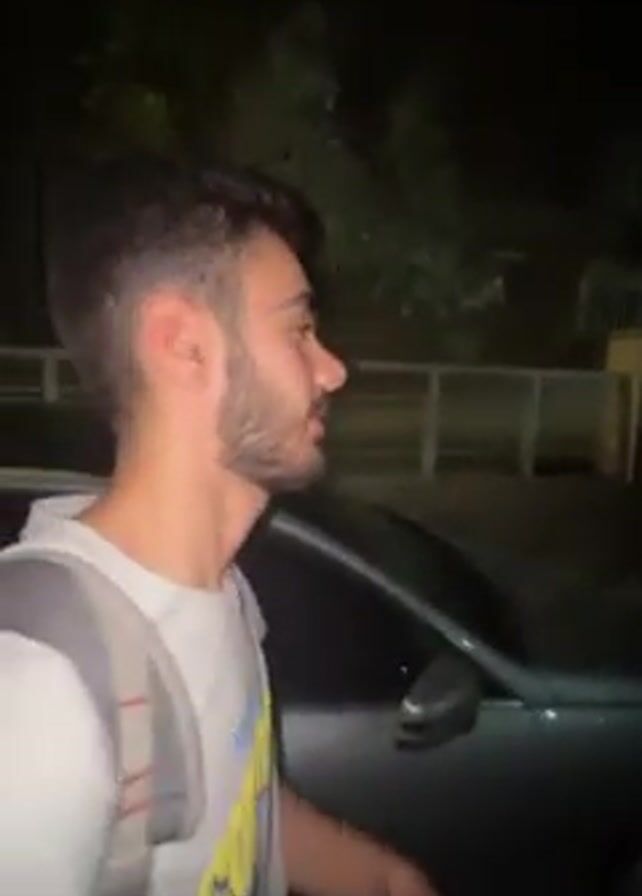 A young man with a beard stands at night, looking at the camera and talking. He is wearing a light gray t-shirt with a colorful design on it, and a strap of a bag is visible over his shoulder. He turns his head to the side and then behind him as he continues to speak. A car is parked behind him. A sign is also visible in the background. The environment is dark.