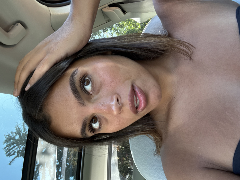 A close-up selfie captures a young adult female inside a vehicle during daylight hours