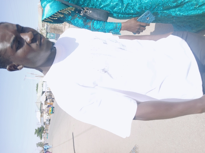 The image captures an outdoor street scene in Ghanzi, Botswana, under bright daylight. In the foreground, a dark-skinned male stands slightly left of center, wearing a white short-sleeved t-shirt with faint dark print and dark trousers. His head is angled downwards and to the right, eyes cast downwards. To his immediate right, a second individual, partially visible, wears a long-sleeved teal garment with an intricate textured pattern. This person carries a black shoulder bag with a thin strap and holds a light blue smartphone with a textured case in their right hand. The background reveals a paved road extending into the distance, bordered by a mix of single-story and multi-story buildings, consistent with commercial or residential structures. Several utility poles with overhead lines are visible along the street. Sparse trees and vegetation are present. Vehicular traffic includes at least one light-colored sedan and a three-wheeled vehicle, possibly an auto-rickshaw, further down the road. Multiple indistinct human figures are observed walking on the left side of the street in the background. The sky is clear and light blue.