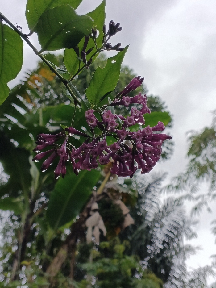 A close-up shot captures a cluster of tubular, pinkish-purple flowers adorned with water droplets. The blossoms hang from a branch with vibrant green leaves, some bearing small holes. The background is a soft blur of green foliage, suggestive of a lush, tropical environment. An overcast sky provides soft, diffused light, highlighting the textures of the plant life.