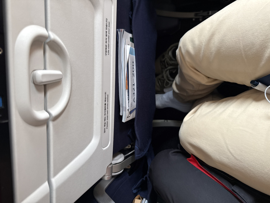 The image depicts an interior view from a passenger's perspective inside an aircraft cabin. The scene does not contain any discernible features to identify its location as Chaoyang District, China. The primary subject is the lower body of an individual, observed from the waist down, seated in an airplane seat. This individual wears light beige or khaki-colored trousers. Their left foot, visible in the foreground, is clad in a light grey sock, with the shoe removed and a pair of dark brown, lace-up shoes resting on the floor directly beneath the seat in front. A white object, possibly a pen or stylus, with a metallic ring attached, is visible resting on the person's lap towards the bottom right. To the immediate left, the upper thigh and hip area of an adjacent passenger are visible, wearing dark trousers, possibly black or navy, with a distinct red stripe or trim running vertically down the outer side. Directly in front, the back of an airplane seat is visible, featuring a light grey or off-white fold-down tray table that is in the upright, closed position. A white latch mechanism is centered on the tray table. Below the tray table, a dark blue fabric seatback pocket is present, holding several documents. Prominently visible on one document is the text "A321-200" and a stylized 'M' logo, likely referring to the aircraft model and airline branding. Above the pocket, on the seatback itself, are white labels with text in Korean and English. The English texts read "Fasten seat belt while seated" and "Life vest under your seat." The floor beneath the seats is covered with a dark, possibly carpeted, material.