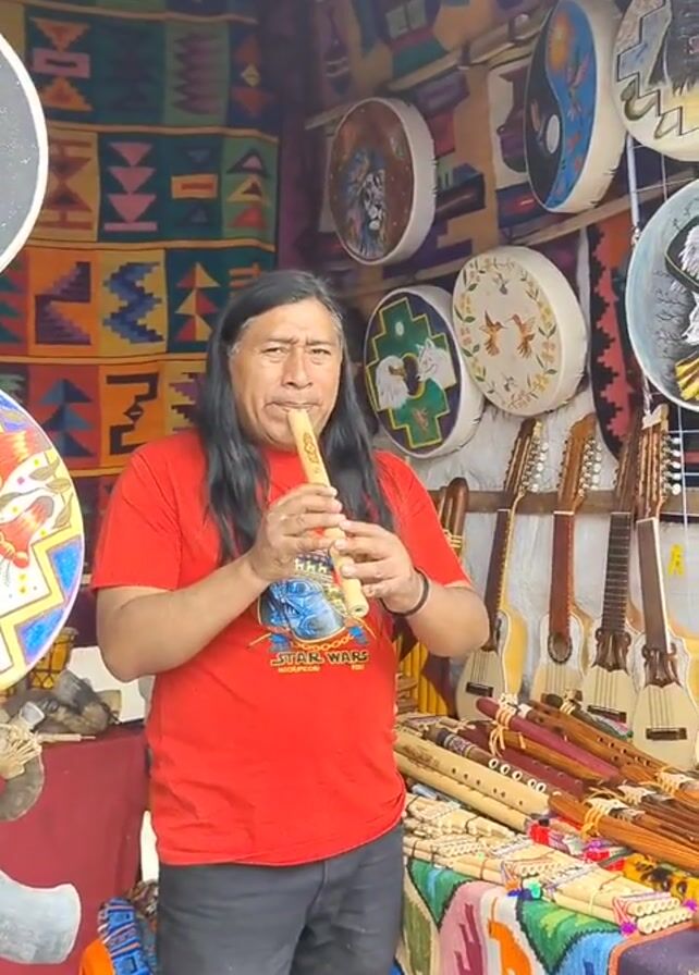 A man is playing a flute in an outdoor market stall. He is wearing a red t-shirt, dark pants, and a watch. He has long, dark hair and a mustache. Behind him is a display of musical instruments including drums, guitars, and flutes. There is colorful fabric and other decorative items hanging around the stall. The man smiles while playing the flute.