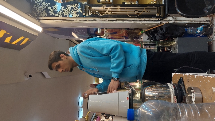 A man in a blue hoodie and black pants leans over a counter, apparently working on a white machine. He is facing left, with a security camera visible on the wall behind him. The scene is cluttered, featuring items such as a broom, water bottles, and various equipment arranged on and above the counter. The upper section of the image shows a decorative gold and black design.