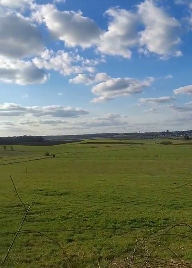 panoramic view of a green field under a bright blue sky with scattered white clouds. The field stretches into the distance, meeting a slightly elevated horizon line. In the distance, a small town or city can be faintly seen on the horizon. The foreground features some brown, dry vegetation. As the video progresses, the camera angle shifts slightly to reveal the sun shining brightly, causing lens flare. A thin tree with bare branches and a wooden post are visible in the foreground. The overall scene appears to be a sunny, rural landscape.