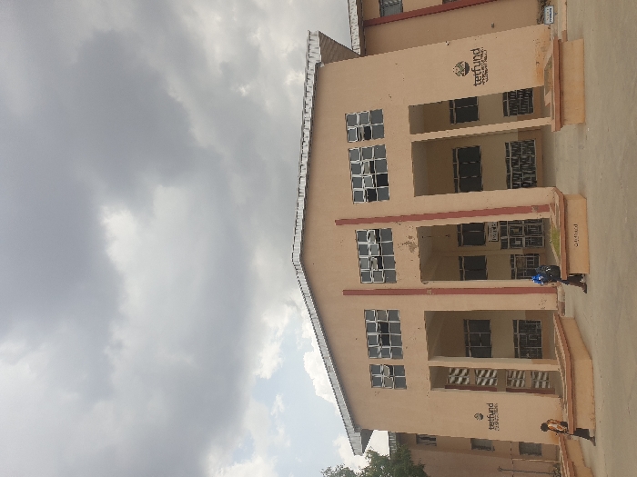 The image depicts the front exterior of a two-story institutional building under a heavily overcast sky in the city of Unknown, Unknown. The building features a light brown facade with multiple rectangular windows, many partially open for ventilation. Its main entrance consists of several large recessed archways. The 'tetfund' logo and accompanying text are displayed on both the left and right sides of the facade. Red vertical lines are visible on some of the building's columns. In the foreground, a paved concrete area leads up to the building, flanked by two low, light brown concrete planters or benches, one bearing the inscribed word 'tetfund'. Two individuals are present: one person, dressed in a dark top and light pants, is leaning on the left concrete structure; a second person, wearing a dark blue top, dark pants, and a blue backpack, is seated on the right concrete structure, looking downwards. No direct interaction is evident between them. A small amount of green foliage is visible on the far left edge of the frame.