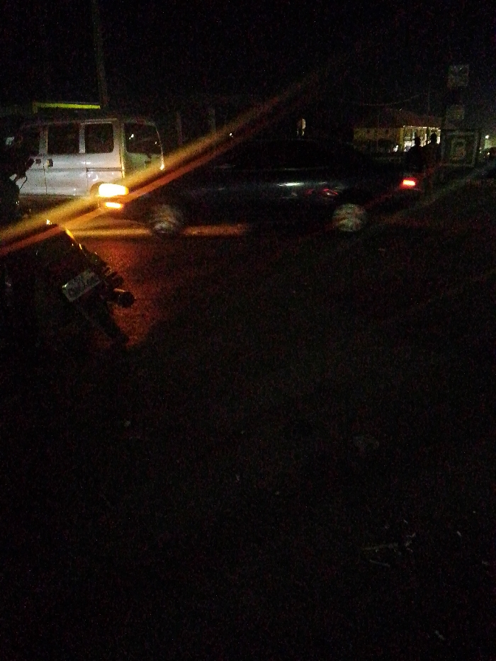 The dark image displays a street scene at night. A white van with a yellow roof rack is partially visible on the left. A dark sedan sits nearby. A motorcycle lies on its side in the foreground, illuminated by the van's headlights. In the background, indistinct figures stand near a building. The scene is dark and the details are obscured by shadows.