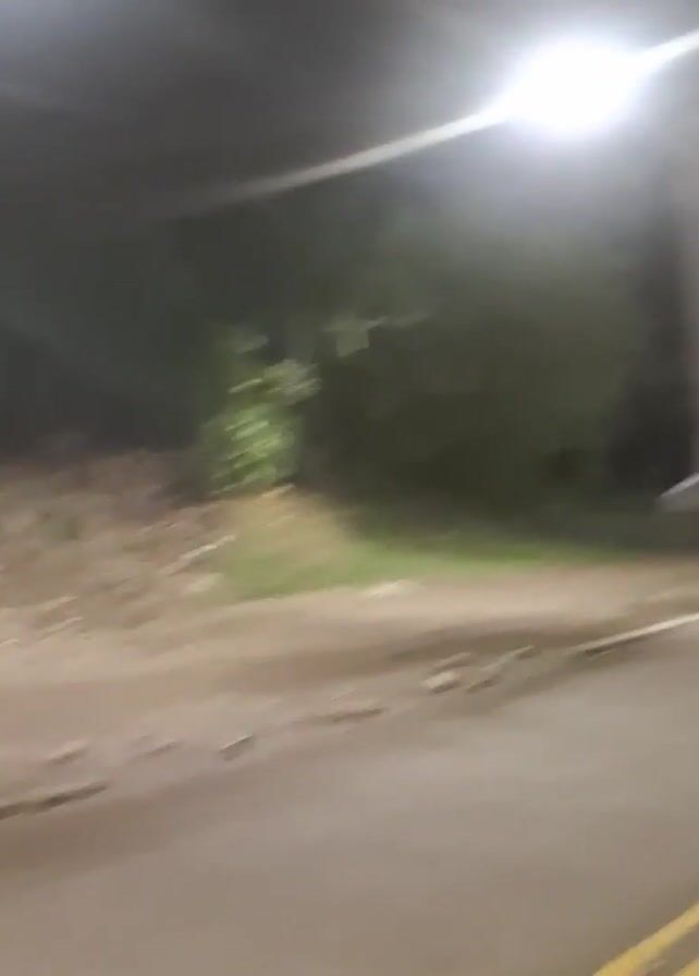 person driving along a road at night, with street lights illuminating the path. The road is marked with yellow lines and bordered by dirt hills on one side and a concrete barrier on the other. A person is briefly seen running along the sidewalk next to the concrete barrier, wearing a white shirt and black shorts. The view then shifts to the area below the road, revealing white concrete pillars and distant car lights.