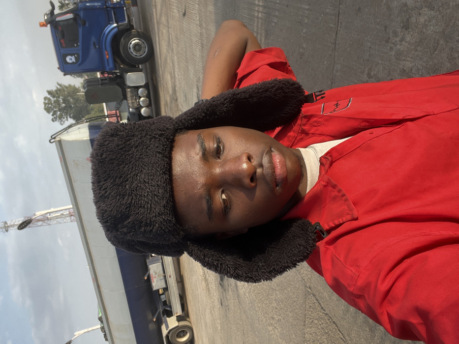 A young Black man wears a fluffy black winter hat with ear flaps and a red jacket. He poses for a selfie in an outdoor setting. A blue semi-truck is parked behind him, with a large white trailer attached. The sky is a hazy, muted blue. The ground is gray asphalt.