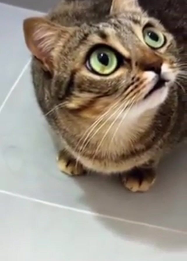 A short video shows a tabby cat. The cat is brown with dark markings and has green eyes. It is sitting on a light-colored tile floor and looking up. The cat seems curious and alert. The video is shot from above. A person's voice is heard in the background.
