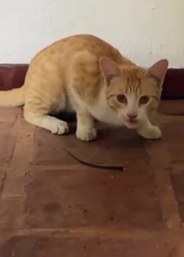 n orange and white cat crouching on a red-brown brick floor, looking intently at a thin, dark, elongated object (possibly a twig or worm) in front of it