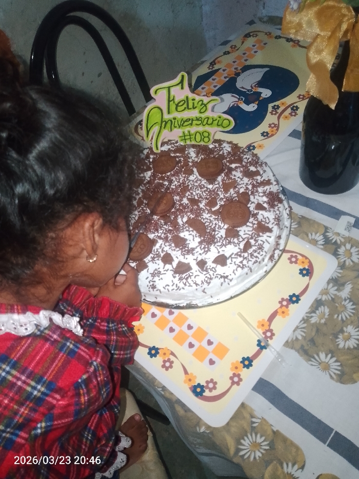 This image, captured on 2026/03/23 at 20:46 in Las Tejerías, Venezuela, depicts a child leaning over a table towards a cake