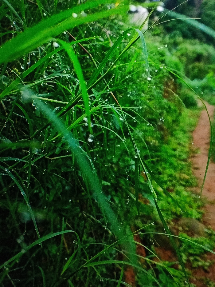 Lush green grass, covered in glistening water droplets, fills the frame. The blades are thin and vibrant, contrasting against the darker green foliage in the background. A narrow, winding dirt path is partially visible on the right, hinting at a natural landscape. The focus is sharp on the foreground grass, capturing the intricate details of the water droplets clinging to each blade.