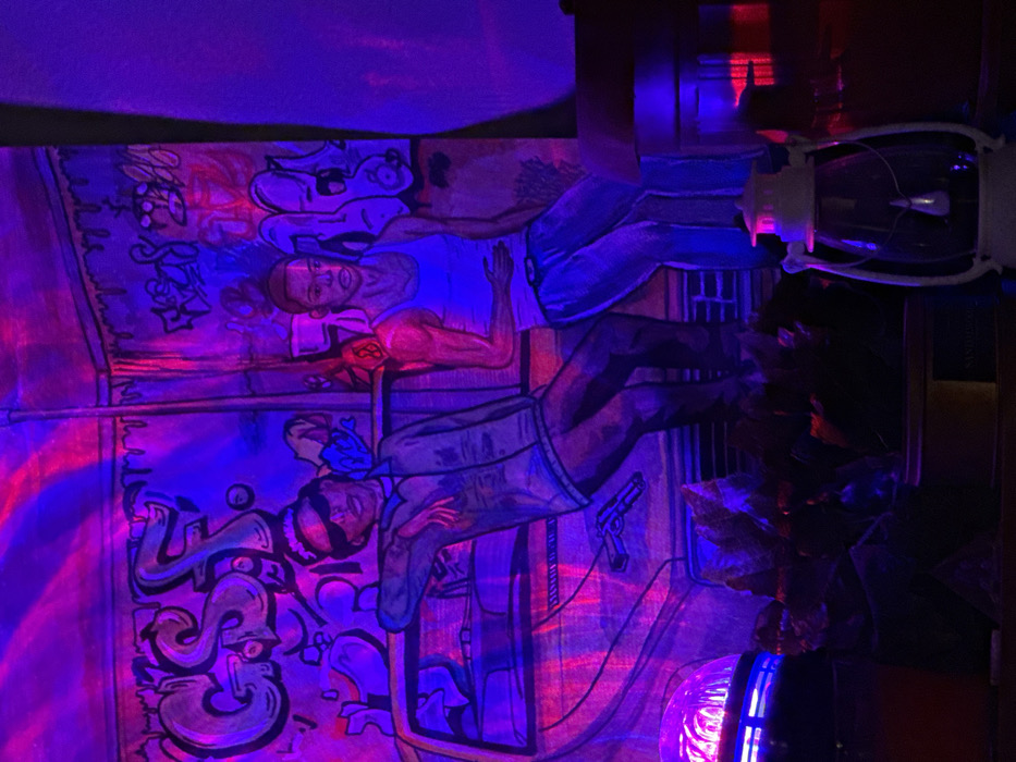 An indoor scene in Novi Pazar, Bulgaria, is illuminated by prominent purple and blue lighting, casting distinct shadows and reflections. The central feature is a large mural depicting two male figures in an urban, graffiti-laden environment. The figure on the left is seated or leaning on a car, wearing sunglasses and a collared garment, with a handgun visible on the car's surface nearby. Above this figure, the stylized graffiti "GSF" is present. The figure on the right is seated, dressed in a white tank top and blue pants. The mural's background includes brickwork textures and additional graffiti tags with dripping paint effects. In the foreground, on a surface below the mural, a purple and blue illuminated disco ball-like object is visible on the left. To the right, a white, traditional-style lantern with a glass globe and internal light source is displayed. Several dark, undefined objects, possibly decorative plants or containers, are situated between these foreground elements and the mural.