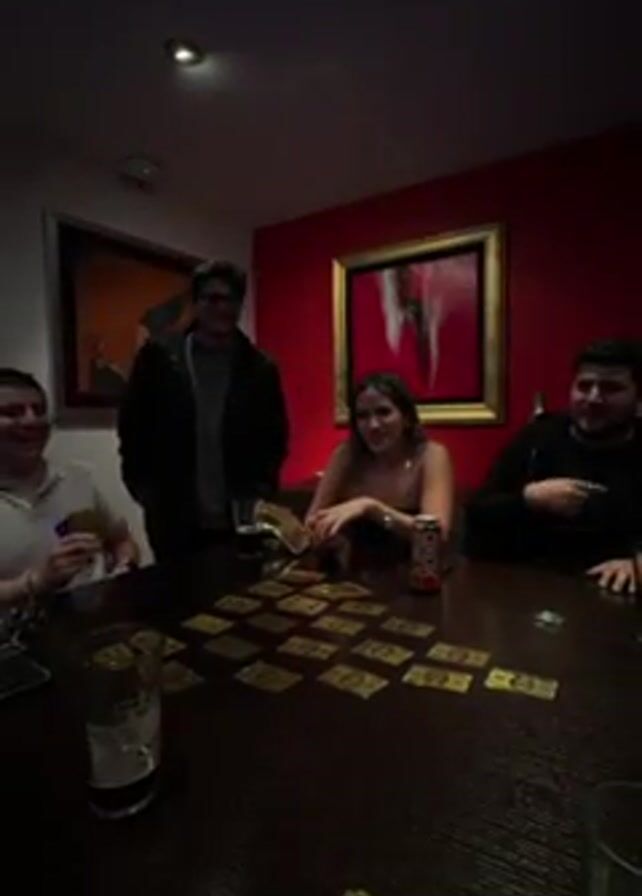 Four people are gathered around a dark wooden table in a room with a red accent wall. Two paintings hang on the walls, one behind a woman sitting at the table and one behind a man standing to the left. The table is covered with golden cards. The woman is dealing the cards. There are drinks on the table including a can of soda and a glass of beer. The people are interacting and talking. The overall lighting is dim.