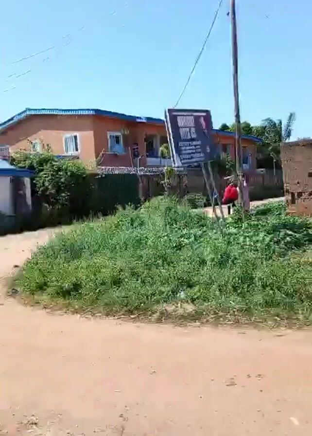 trip down a dirt road. In the first shot, there is a bus stop to the right, and two figures walking further down the road. The camera then passes a building with a blue roof and eventually a sign that says “BIO-KAFRED MEDICAL LABORATORY.” There are two people walking by on the road at that point. The camera continues to move past some other buildings, and some signage. The sky is clear and blue.