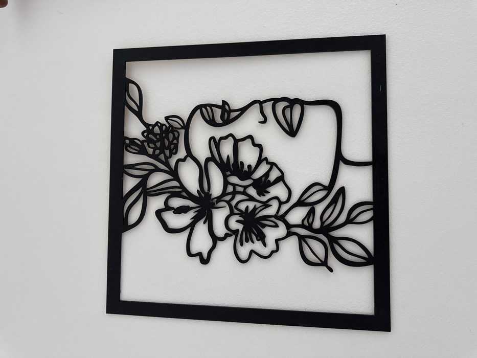 A black square frame encloses a minimalist portrait of a woman's face intertwined with floral elements. The woman's profile is depicted using continuous lines, suggesting the curve of her cheek, the shape of her nose, and the suggestion of eyelids. Several flowers with intricate detailing, alongside leaves and branches, create an elegant and flowing design. The entire artwork is mounted on a plain white wall.