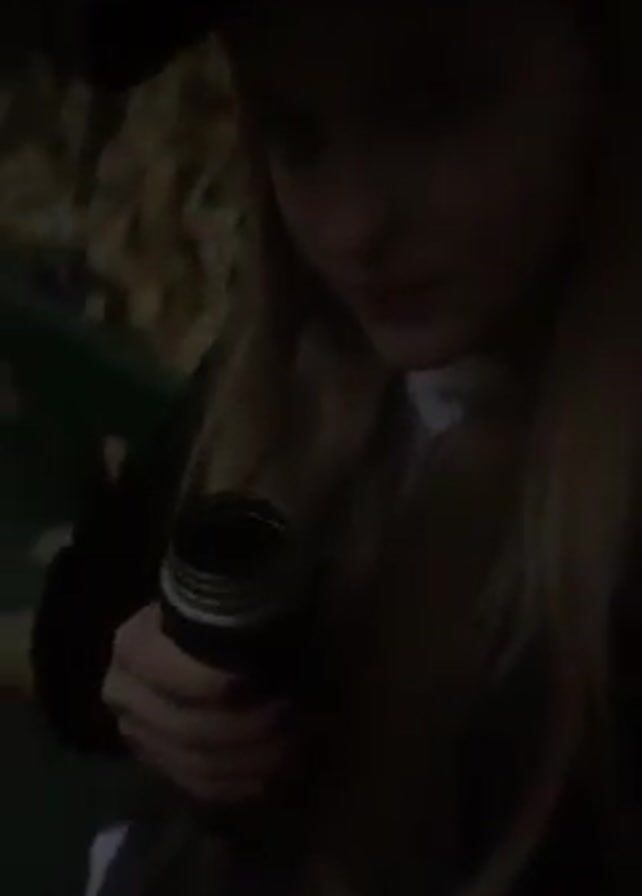 A blonde woman wearing a baseball cap, dark jacket and black pants stands outside holding a black travel mug