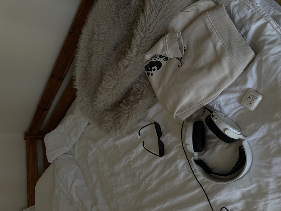 The image depicts an indoor scene within a dwelling in the city of Sighnaghi, Georgia. A bed with a visible natural wood frame is positioned against a plain light-colored wall. The bed is unmade, covered with wrinkled white sheets and a white pillow on the left side. A light beige, shaggy faux fur throw is draped across the middle-right section of the bed. On the white sheets, a light beige sweatshirt is folded, partially overlapping the fur throw. The sweatshirt displays a black graphic print on its upper left chest, featuring a stylized animal head and partial black text reading "creativ". A pair of black-framed sunglasses with dark lenses is laid on the white sheet above a pair of white over-ear headphones, which have black ear cups and an attached black cable. A white Apple AirPods case, adorned with a small cartoon animal graphic, rests on the white sheet to the right of the headphones.