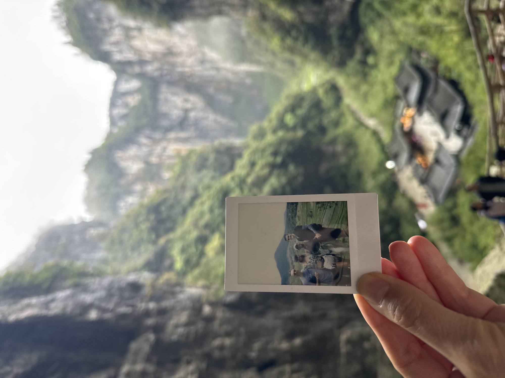 A medium shot depicts a right-oriented hand holding a small, Polaroid-style photograph against the backdrop of a blurred scenic view. The photograph within the photograph displays a group of five individuals. The background appears to feature a mountainous landscape densely covered with greenery. Above the mountains, the sky is partially visible. The setting is located in Wulong District, Chongqing, China, specifically at the Wulong Karst geological park, with the view most likely originating from the Tianlong Bridge (天龙桥).