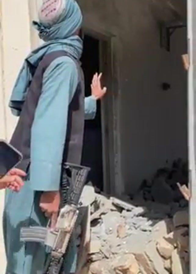 man in traditional Afghan clothing and a head wrap, holding an assault rifle, standing near the entrance of a damaged building