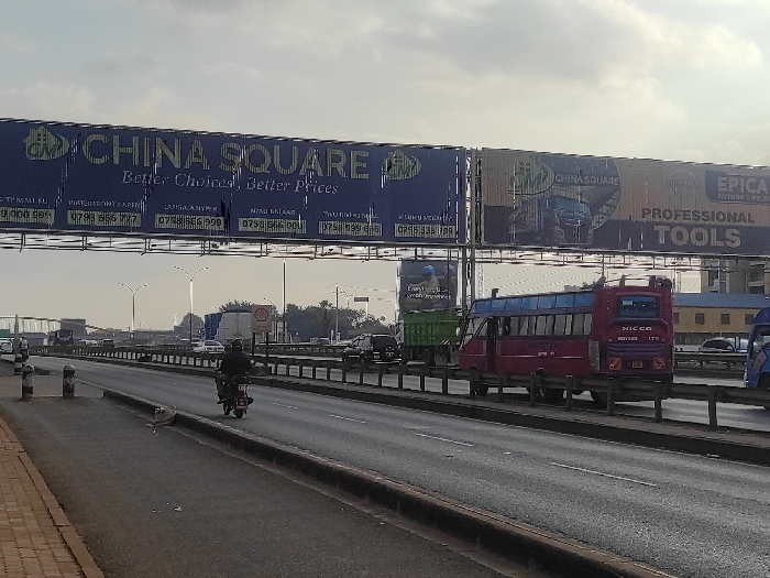This image captures a daytime scene on the Thika Road Superhighway in Nairobi, Kenya, under an overcast sky