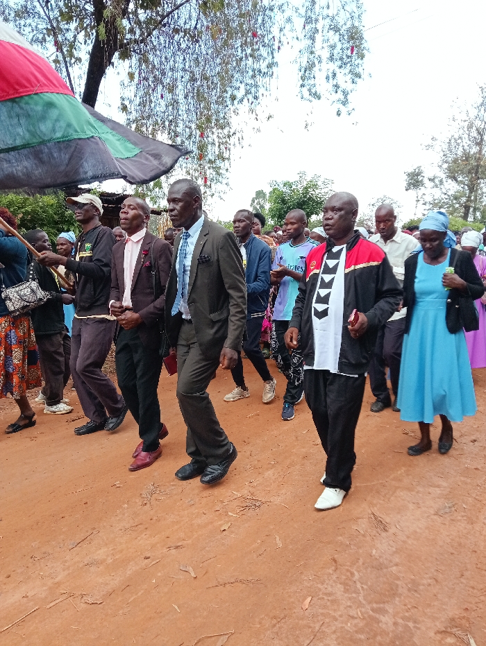 A procession of approximately 15-20 individuals, predominantly adults, is observed walking on a reddish-brown dirt path in Lumakanda ward, Kenya