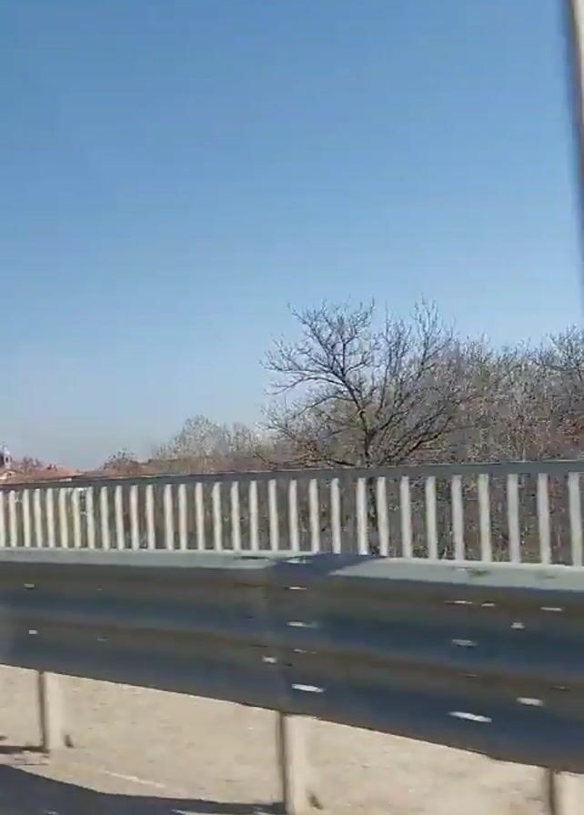 moving car driving over a bridge. The bridge has metal railings. On either side of the bridge, there are trees without leaves. The water of the river or lake below is visible. The sky is clear and blue. There is a streetlight on the bridge.