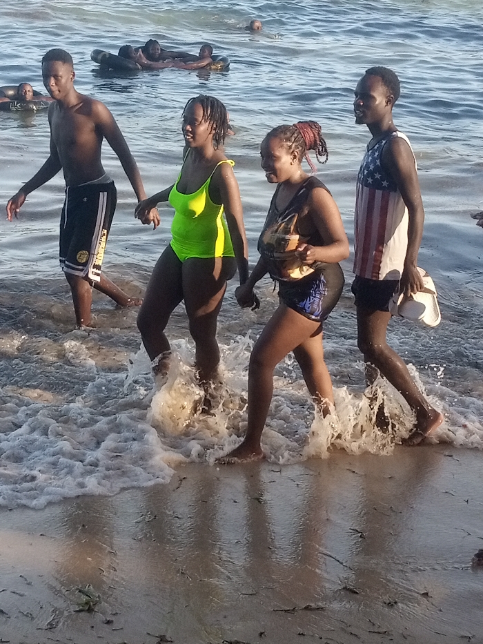 The image depicts a group of individuals in the shallow waters of the Indian Ocean at Shanzu ward, Kenya, during daylight