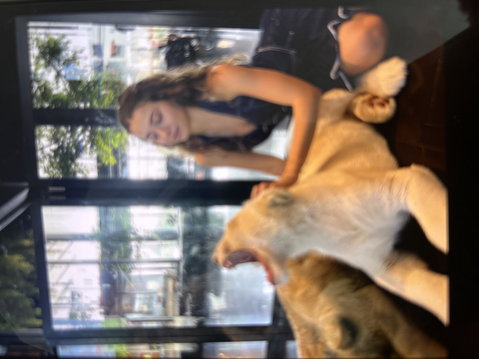 This image depicts an indoor scene within a commercial establishment in Varna, Bulgaria, likely an animal encounter facility. A young female individual is positioned on the right side of the frame, leaning forward towards two lion cubs. She has long, wavy, light brown hair and is wearing a dark, possibly navy or black, halter-neck top and dark pants with visible white stitching on the right leg. Her eyes appear closed or mostly closed, and she exhibits a serene expression while her right hand rests on the back of a lion cub. In the foreground, two light-colored lion cubs are lying on a dark, flat surface, possibly a table or platform. The cub in the immediate foreground, positioned centrally, is a pale, possibly white lion cub, with its mouth wide open in a distinct yawn or vocalization, revealing its pink oral cavity and teeth. Its front paws are extended forward. Partially visible behind and to the left of the prominent cub is a second, slightly darker, tawny-colored lion cub, also lying down. The background consists of large, dark-framed windows, through which a blurred urban environment is visible. This includes green foliage from trees and indistinct building structures, suggesting an outdoor city setting beyond the indoor facility. The lighting indicates daytime.
