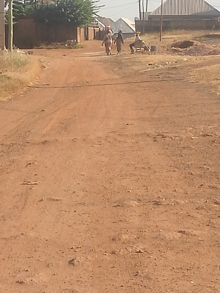 The scene depicts an unpaved, reddish-brown dirt road extending into the background in the city of Unknown, Unknown, under a clear, bright sky. Three individuals are observed in the mid-ground. Two individuals, dressed in light-colored garments, walk away from the viewer along the road. The lead individual carries a reddish-brown object on their head. The second individual follows closely behind. A third individual, wearing light clothing and a head covering, is seated on a light-colored object on the right side of the road, facing towards the left. Adjacent to the seated individual are a dark container and a pile of disturbed earth. Structures with earth-toned walls and corrugated metal roofs, along with sparse green vegetation and utility poles, are visible in the background. The road surface exhibits tire tracks and minor undulations.