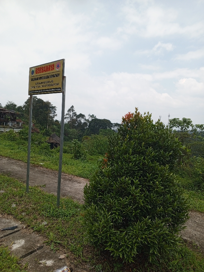 The image depicts an overgrown, semi-rural outdoor scene under a cloudy sky. In the foreground, a rectangular yellow sign on two grey metal posts is positioned on the left side of a narrow, winding concrete or paved path. The sign bears text in Indonesian, including "BERBAHAYA" (Dangerous) and "DILARANG MENDIRIKAN BANGUNAN" (No Building Construction), along with two distinct logos, indicating the location is in an Indonesian-speaking region, not Multhan, India. To the right of the path and in the immediate foreground, a dense, green bush with reddish-orange new growth occupies the lower right quadrant. The ground surrounding the path is covered in tall grass and various types of unkempt vegetation. In the midground, left of the sign, a small, rustic hut with a dark, possibly thatched roof is partially visible amidst the foliage. Further back on the left, a larger, dilapidated structure with exposed framework and a dark roof is discernable through the trees. The background consists of a dense treeline and overgrown wilderness, extending towards the horizon under a light grey, overcast sky with scattered white clouds. No people or active interactions are present in the scene. Debris, including a black object and crumpled material, is visible on the ground near the bottom left of the frame.