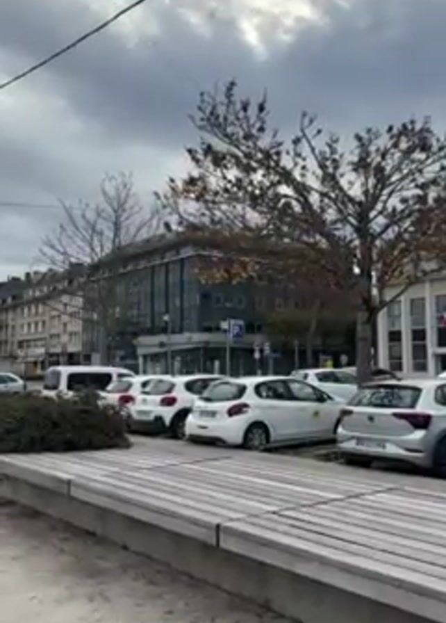 The video depicts a city street scene on a cloudy day. The camera is positioned at ground level, facing a row of parked cars, predominantly white, next to a raised wooden platform. A low hedge separates the platform from the cars. In the background, there are buildings of varying heights, including a modern structure with a glass facade. Bare trees with some remaining autumn leaves stand along the street. The sky is overcast with grey clouds. The scene is still, with no apparent movement.