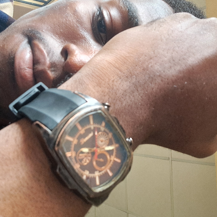 A close-up photograph depicts a single male individual with dark skin, partially obscured by his right forearm. His right eye, nose, mouth, and chin are visible, with his gaze directed towards the camera. He wears a prominent cushion-shaped wristwatch on his right wrist, featuring a dark dial with metallic hour markers, three sub-dials, and metallic hands with red accents. The watch case has a metallic-toned bezel, possibly rose gold or copper, and is secured by a black rubber strap with a visible buckle. A dark blue garment is visible on the lower left. The background is out of focus, showing a light-colored indoor ceiling composed of rectangular panels. The exact location within Ihiagwa, Nigeria, is not discernible from the visual content.