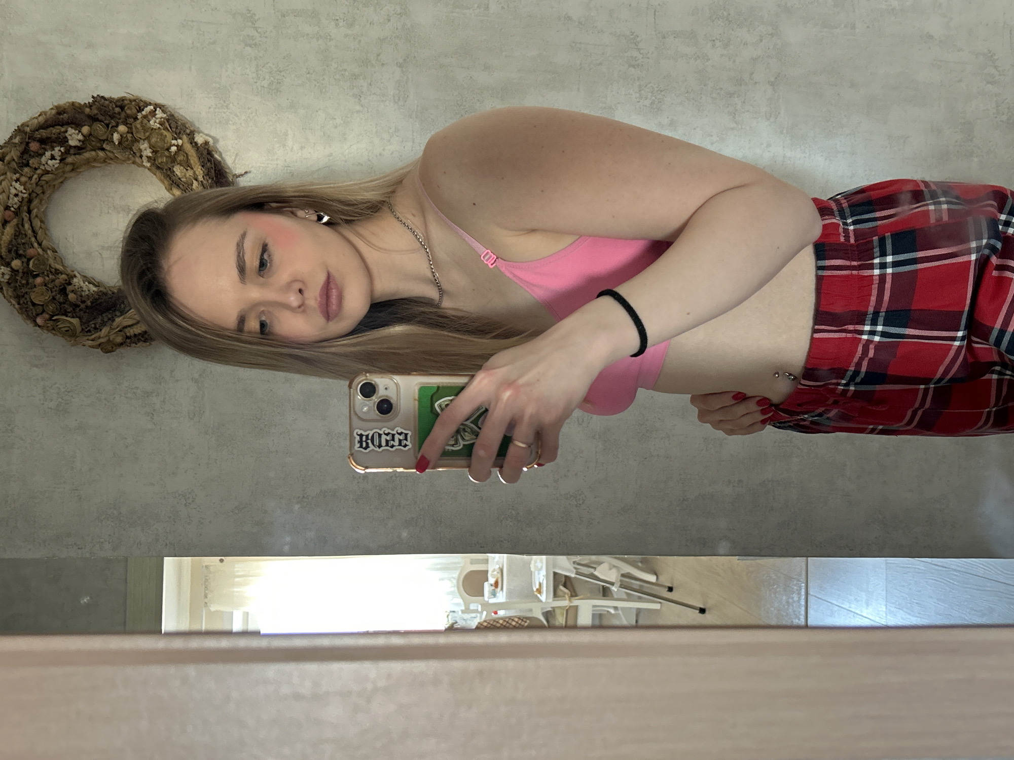 A woman is taking a selfie in a mirror. She is wearing a pink bra and red plaid shorts. The phone case has a green design and the word "BOSS" printed on it. She has a belly button piercing. The background shows a wreath on a gray wall and a reflection of a room with a table and chairs. The reflection of the room appears to show a child's furniture or highchair. The photograph was likely taken in Chaikovsky, Russia.