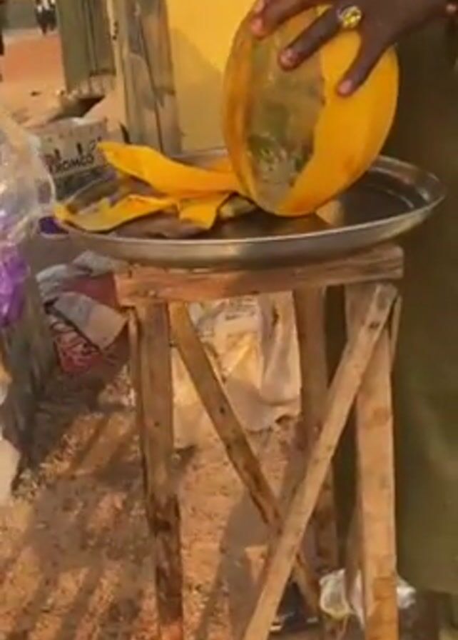 A man is peeling a papaya on a silver tray atop a wooden stool