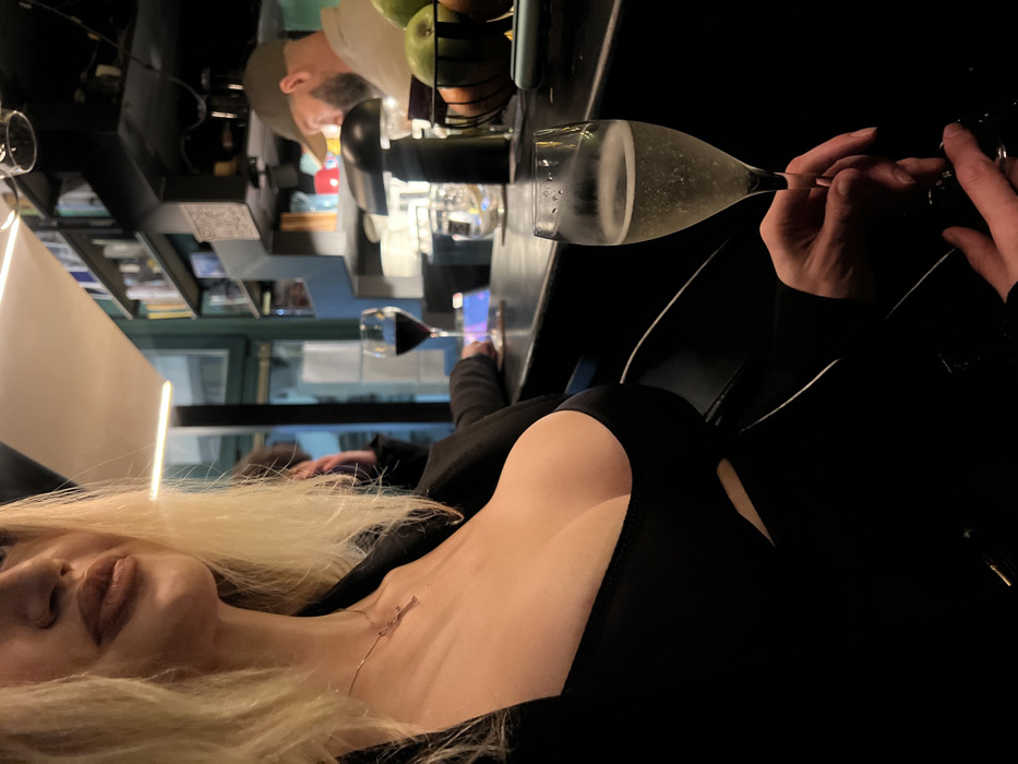 A low-angle shot captures a blonde woman in a black top with a visible décolletage, seated at a bar. A glass of sparkling wine is near her hand, while another glass of red wine sits further along the bar. In the background, a man stands behind the bar area, near a fruit basket. The perspective is slightly tilted, creating an intimate, nighttime ambiance.
