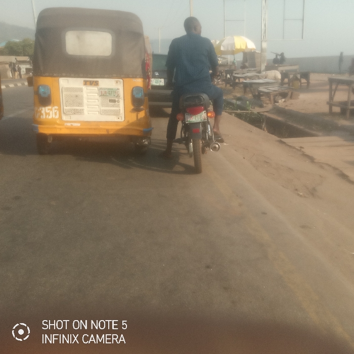 A man in a blue shirt rides a motorcycle on a paved road next to a yellow auto rickshaw. The rickshaw has a "356" number painted on its back. Cars are visible in the background, and some wooden tables and white umbrellas are set up on the right side of the road. The image is slightly washed out, suggesting bright daylight. The phrase "SHOT ON NOTE 5 INFINIX CAMERA" is printed in the bottom left corner.