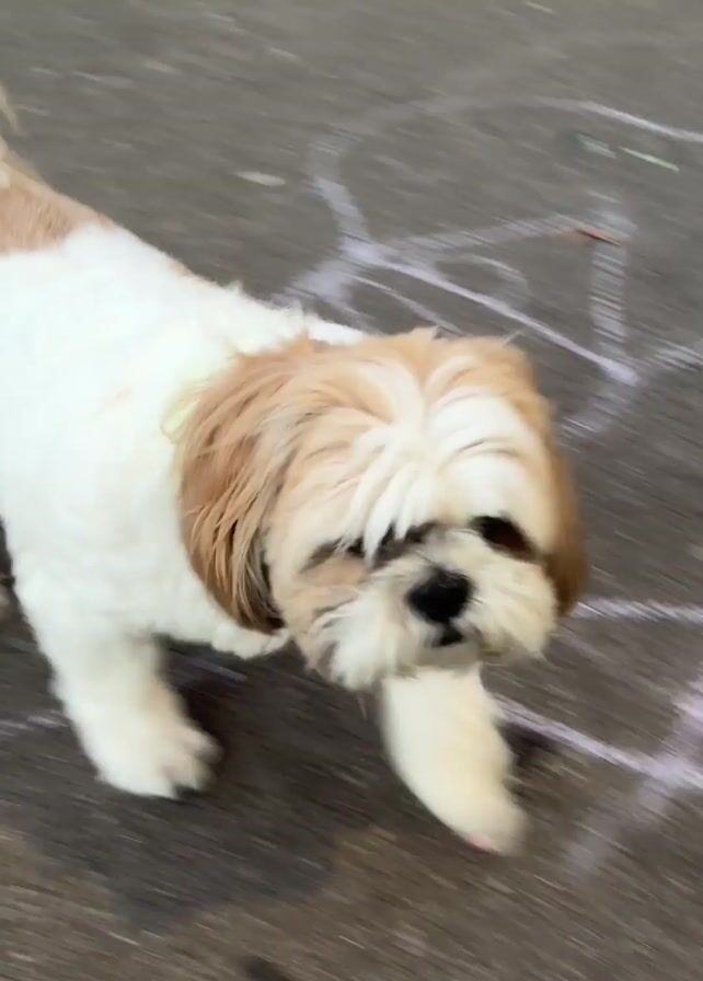 A small, white and tan dog with long hair walks on a gray sidewalk toward the camera. The dog appears to be a Shih Tzu. The dog has a neon green collar. There is chalk writing on the sidewalk. The camera follows the dog as it veers to the right. A leg in blue jeans enters the frame, suggesting a person is walking with the dog.