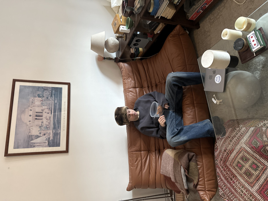 This indoor scene depicts a living room within a residence in Stockholm, Sweden. A person is seated centrally on a segmented brown leather sofa. The individual wears a brown fur hat, a dark grey long-sleeved shirt, and blue jeans, holding a transparent plastic container filled with brown granular material in both hands. To the left of the seated individual, a multi-colored plaid blanket is draped over the sofa. Above the sofa, a framed print of an architectural illustration labeled "A SAILING PAVILION" is mounted on a light-colored wall. In the immediate foreground, a glass coffee table with a spherical opaque base displays a silver laptop, a set of keys including a red-handled Swiss Army knife, a white cylindrical object, three white candles of varying heights, a stack of dark circular coasters, and a small green box labeled 'THREE STARS SAFETY MATCHES - CHICAGO'. To the right of the sofa, a dark wooden open-shelving unit holds a beige table lamp, a smaller red lamp, various books, a wooden box, a green ceramic bowl, and a wooden duck figurine. The floor is covered by a geometrically patterned rug in shades of red, beige, and brown.