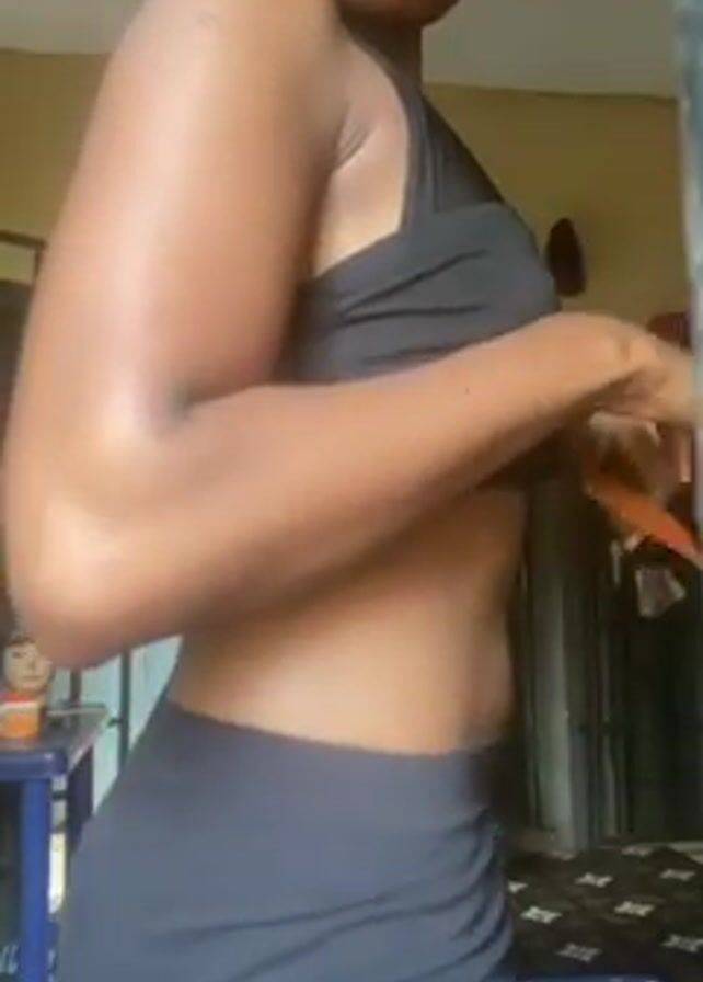 A person is seen in profile, indoors. They have brown skin, dark hair, and wear a black crop top and black shorts. They are standing and appear to be chewing or playing with their tongue. The room is simple, with a patterned rug, a small table, and a shelf visible. The light source seems to be coming from the side.