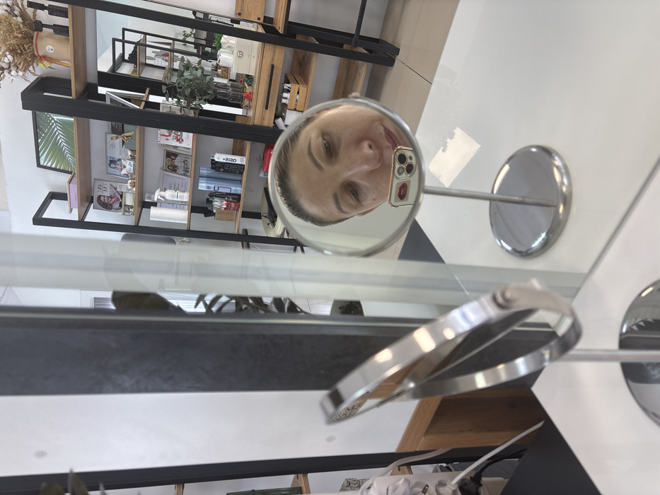 The image depicts an indoor scene in the city of Chaikovsky, Russia, likely a beauty salon or aesthetic clinic. In the foreground, the silver-framed back of a circular magnifying mirror on a stand is visible on a reflective white surface, presumably a counter or table. Reflected in a second, identical mirror positioned further back on the same surface, the upper portion of a woman's face is seen. She is looking downward and to the right, with her hair pulled back and visible skin imperfections. A white smartphone with a gold border and a red lip decal on its case is held up by the woman, visible in the reflection as she presumably takes a selfie. The background, also reflected in the main mirror, features a tall, black metal shelving unit with wooden shelves holding various beauty products, framed photographs, a green plant in a vase, and dried floral arrangements. A white wall is visible behind the shelving unit. The environment appears well-lit.