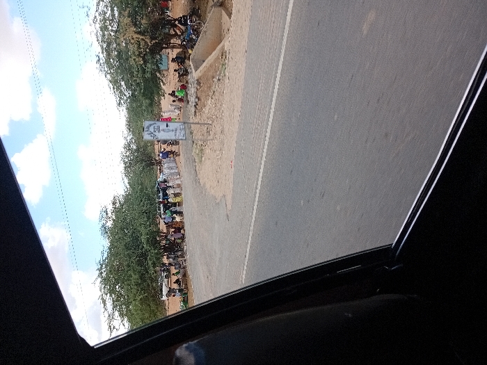 View from inside a vehicle, possibly through a sunroof, looking out onto a road. A line of people and stalls border the left side of the road, backed by trees. A sign is visible among the stalls. The road occupies the right side of the frame. The sky is visible in the upper left corner, with scattered clouds.