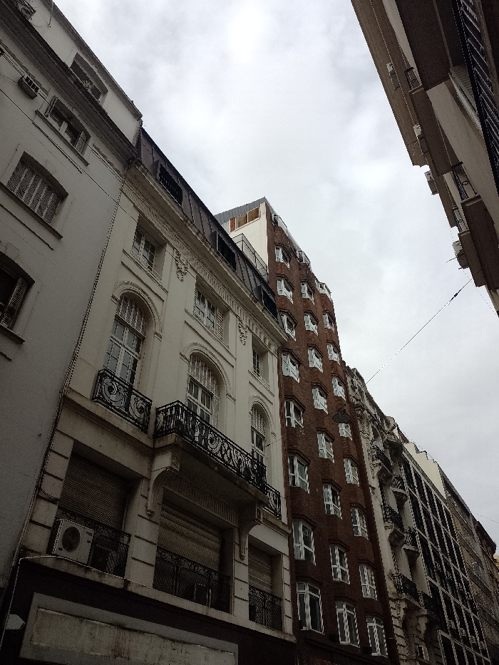 The image captures a street view of tall buildings under a cloudy sky. The structures exhibit various architectural styles, with white facades, arched windows, ornate balconies, and some with a brick-like texture. Multiple windows line the buildings, and wiring stretches across the space between them. An air conditioning unit is visible on one building, and awnings are in use. The image is taken from a low angle.