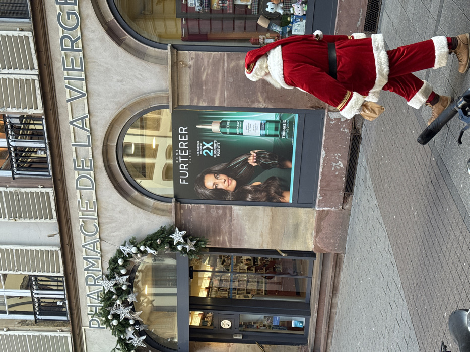- "An individual dressed in a red Santa Claus suit with white trim, a black belt, and a matching hat is captured walking leftward on a paved sidewalk in front of the "Pharmacie de la Vierge" in Strasbourg, France" by FM-IL2Dl2, licensed under CC BY 4.0
