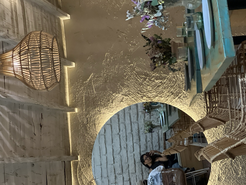 A rotated view captures a restaurant or cafe interior. A wicker-style pendant light hangs to the left. A large, arched mirror reflects a white brick wall, chairs, and a person taking a selfie. Above the mirror, a decorative display includes artificial flowers, glassware, and plates. The walls are textured, with patterned highlights around the mirror and pendant light.