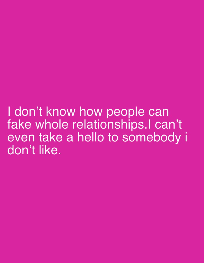 The image displays a solid, vibrant magenta background. Centered horizontally and occupying the lower half of the frame is white, sans-serif text. The text reads: "I don't know how people can fake whole relationships.I can't even take a hello to somebody i don't like." There are no discernible people, subjects, objects, or actions depicted. The environment is abstract, consisting solely of the magenta background and white text. No visual information within the image provides any indication of a physical location, including the city of Sofia, Bulgaria.