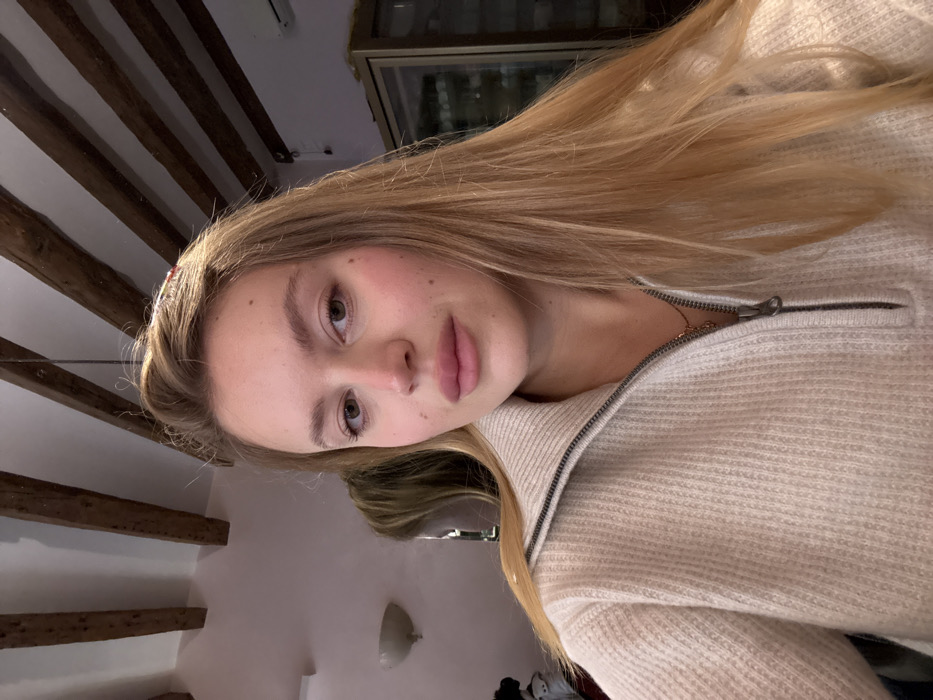 An indoor, close-up, frontal portrait features a single female subject. She possesses light brown/blonde hair, parted on the left, extending past her shoulders, with small colorful clips visible near the top of her head. Her eyes are greenish-brown, and her lips are full with a pinkish tint. Her complexion shows minor blemishes/freckles. She wears a light beige/cream quarter-zip sweater with a waffle knit texture and a small metallic zipper, with a delicate necklace visible beneath the collar. Her gaze is directed straight at the viewer. The background elements are consistent with a commercial establishment. Above, a light-colored ceiling features three distinct, dark exposed wooden beams running horizontally. To the left, a light-colored wall includes a white, half-bowl wall sconce and a blurry reflection in a mirrored surface, showing the back of a head and shoulder. To the right, another light-colored wall reveals a tall, glass-fronted refrigeration unit containing multiple bottles, likely wine. The general environment, with its wooden beams and wine display, is indicative of a restaurant, bar, or wine shop. While the interior design elements could be found in various locations, the scene presents an indoor environment consistent with establishments located within the city of Venice, Italy. No specific landmarks or unique Venetian architecture are visible to pinpoint an exact address within Venice.