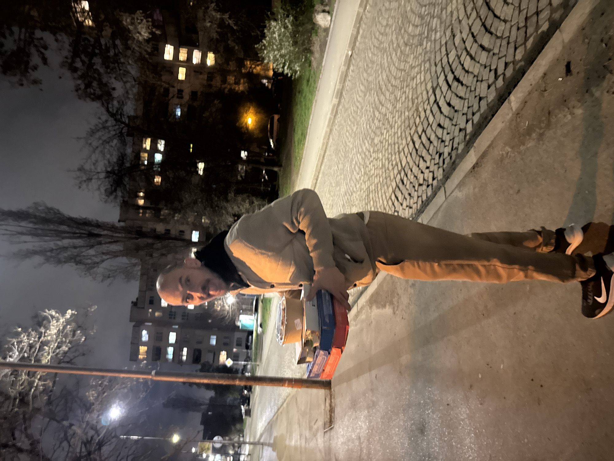 The image depicts a man standing on a sidewalk in Sofia, Bulgaria, at night. He is holding several boxed items and a roll of tape in his hands. He is wearing a light-colored jacket, tan pants, and black Nike sneakers. The sidewalk is adjacent to a cobblestone street. In the background, there are trees and buildings with lit windows, indicating an urban setting. A lamppost is visible on the left side of the image. The lighting is dim, with some illumination from streetlights and building windows.