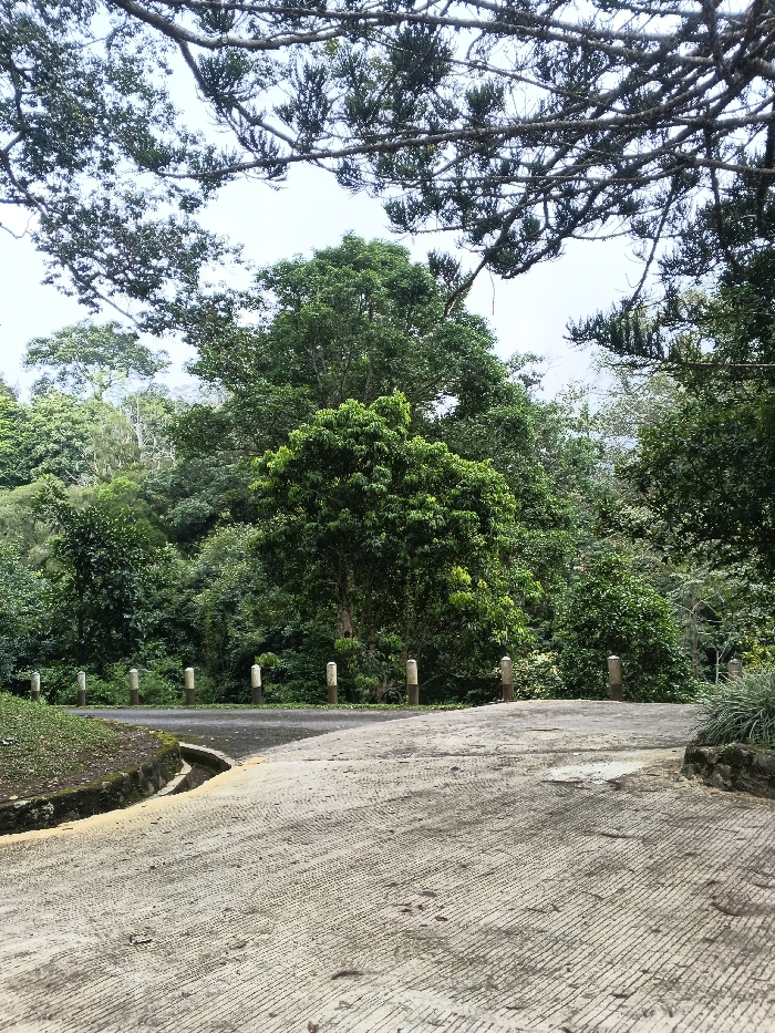 The scene depicts an outdoor pathway within a densely vegetated area in Kwekwe, Zimbabwe. The foreground features a light-grey concrete surface textured with parallel grooves, suggesting a paved road or access point. To the immediate left, a short grassy bank shows exposed dark soil and a concrete gutter containing yellowish-brown sediment. A low stone wall or raised planter with green foliage is visible on the right. In the midground, the path transitions into a darker, asphalt-like road that curves sharply to the left. Along the outer edge of this curve, approximately eight light-colored, cylindrical bollards, each with a distinct dark base, are evenly spaced. Beyond the road, the environment is dominated by a dense, verdant expanse of various green trees and shrubs, forming a thick, continuous wall of foliage. Overhead, the top portion of the frame is partially obscured by the dark, intricate branches and sparse leaves of an unseen tree canopy. The sky, visible intermittently through the foliage, appears light, indicating daytime. No individuals, vehicles, or animals are present in the frame.
